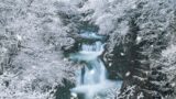 真っ青な青空の下、朱色の灯籠に真っ白な雪が降り積もっている景色は絶景!「貴船神社」