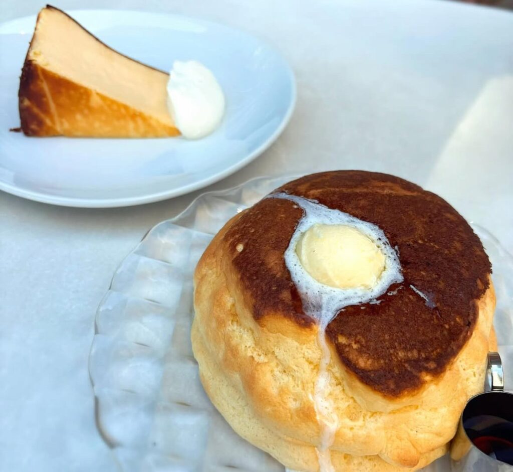 ホワイトチョコを割るとベリーソースとムースが入ってて、下の塩サブレのアクセントが美味しいです。マスカルポーネ&蜂蜜レモンのパンケーキなども大人気で、こちらはレギュラーメニューとなってますのでいつでも食べれます。