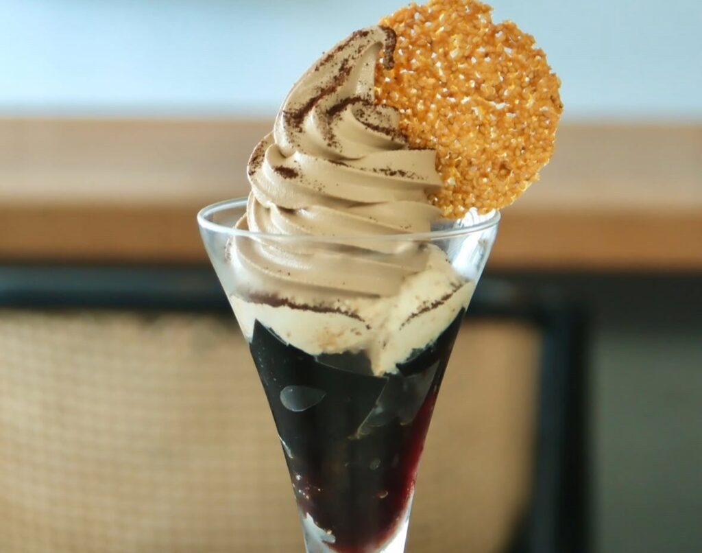 桜新町の店舗のみで販売しているカフェオレソフトサンデーがおすすめです。丸い形の白ゴマとオレンジ風味のチュイルと小川珈琲オリジナルのカフェオレソフトにコーヒーゼリーが入った構成のサンデーとなっています。