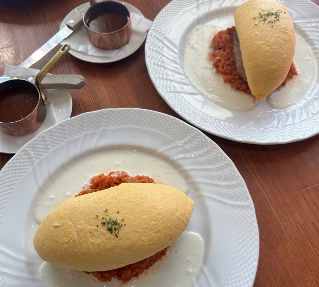 ナイフを入れるとトロッとした卵が溢れ出すふわとろな卵が◎デミグラスソースとチーズソースを絡めて頂く、超贅沢です。