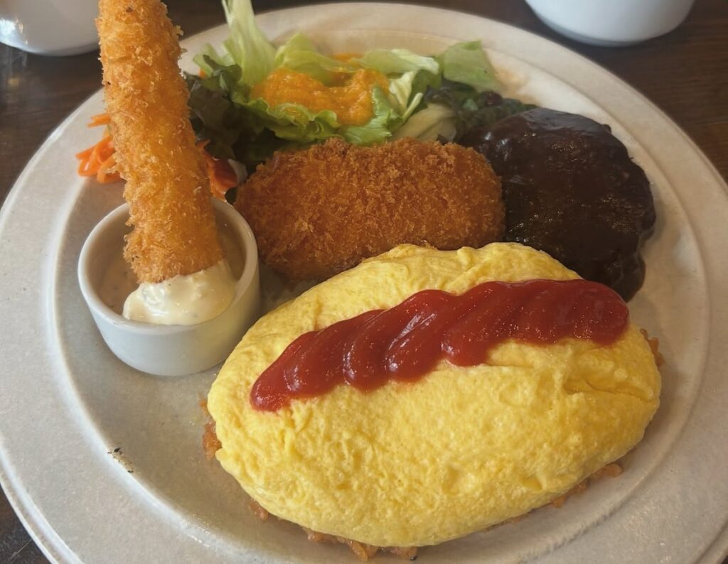 ホテルの1階にある大人気カフェです。オムライスがめっちゃ美味しい!中野坂上のフランキー&トリニティ的なふんわりしていて優しい味です。そこに肉汁ジュワッとハンバーグに、エビフライとカニクリームコロッケが載っています。