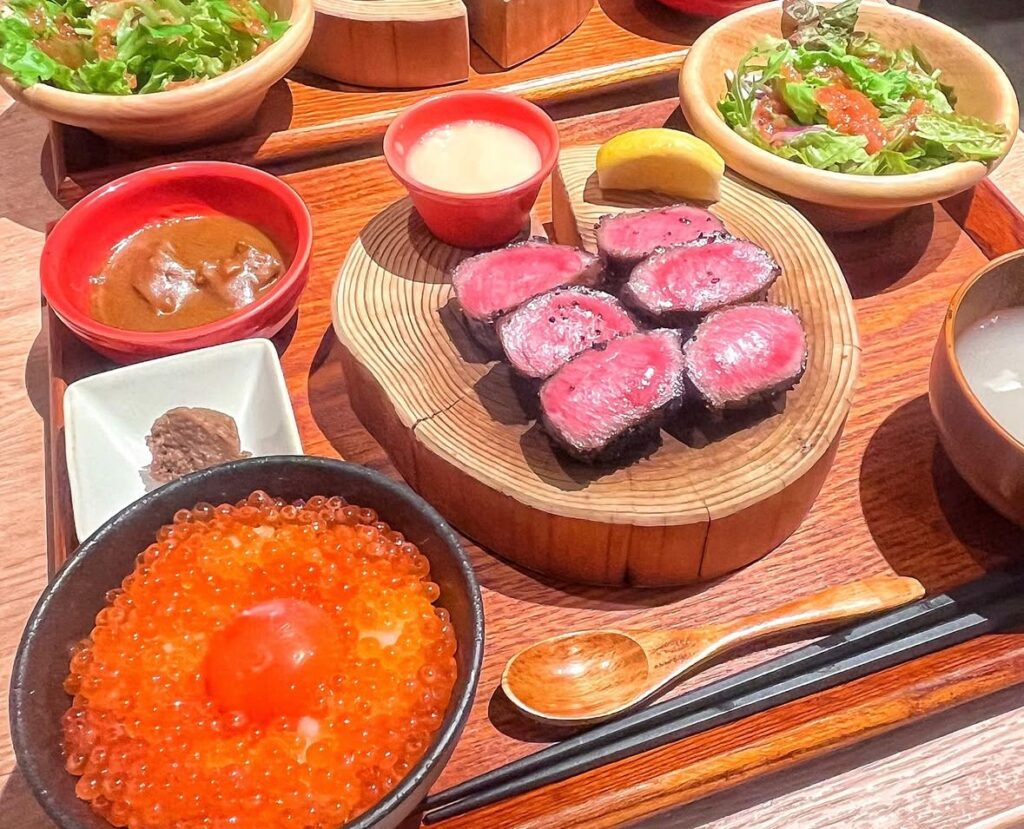 SNSでバズってるお店です。セット内容は、羽釜炊きご飯/牛タンスープ/牛タンカレー/牛タン肉みそ/とろろ/サラダ がデフォでついてきて、+1,190円で羽釜炊きご飯からいくら卵黄ご飯に変更することが可能となっています。