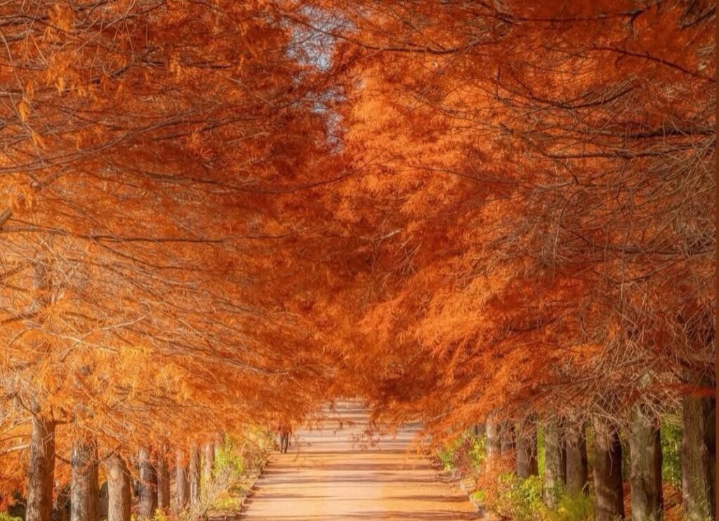 オレンジ色のラクウショウ並木が絶景です。羽状の葉っぱが落ちることから“落羽松(ラクウショウ)”と名付けられました。ファンタジーロードと名付けられたラクウショウという高木の並木道を見に訪れてみませんか?