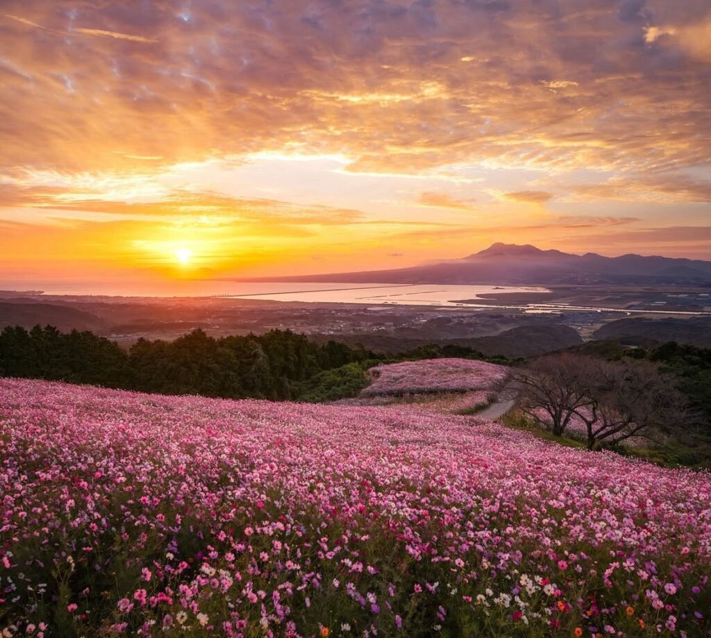 花畑の向こうに有明海と雲仙岳、とってもいいところです。コスモスが一面に咲いていてとっても綺麗!高原の斜面を覆い尽くしています。刻々と変わっていく景色が本当に素晴らしいです。24時間オープンになっているのでいつでも入れます。
