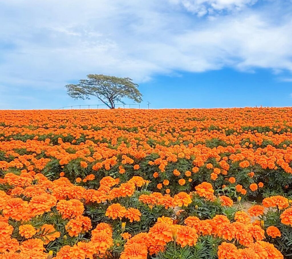 一面のマリーゴールドに囲まれて楽園にいる気分です。丘が鮮やかなオレンジ色に染まっています。マリーゴールドが咲く季節になりました。10月のおすすめしたい名スポットです。オレンジ色の絨毯は圧巻となっています。