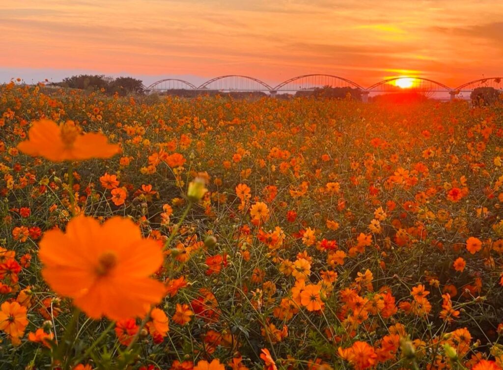 吹上コスモス畑のオレンジ色のキバナコスモスが絶景です。夕焼け空になるとキバナコスモスと一体化した風景が観れてとっても素敵となっています。ピンクや赤、白、黄など約1,000万本のコスモスが咲き乱れているんです。