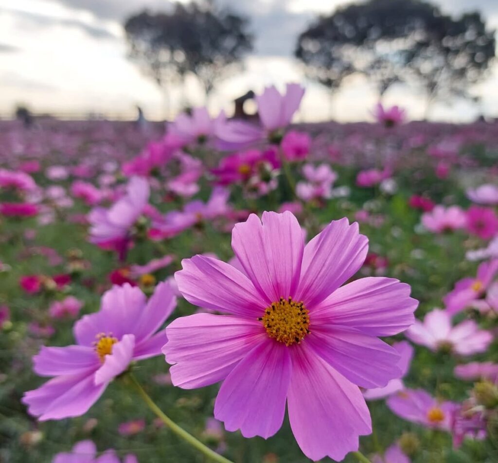 コスモスフェスティバルに訪れてみませんか?夕陽に染まる 黄昏れ 秋桜を楽しみましょう。このコスモス畑には6品種が植えられています。