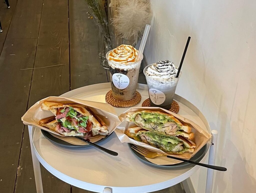ミントグリーンのドアがかわいいです。中に入るとドライフラワーがいっぱいとなっています。かわいい丸いテーブル席2つとカウンター席があるんです。ホットサンド色んな種類あります。ハーフサイズを3種類頼むのがおすすめです。