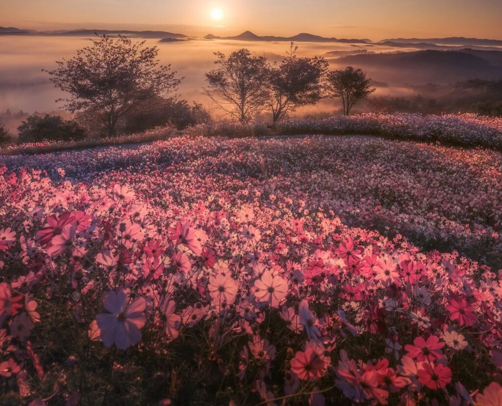 朝陽を浴びるコスモスが美しいです。コスモスに包まれた朝は絶景となっています。どこまでも続くコスモス畑に感動です。丘の上から撮るのがおすすめ!雲海の上に広がる一面のコスモスなども人気です。