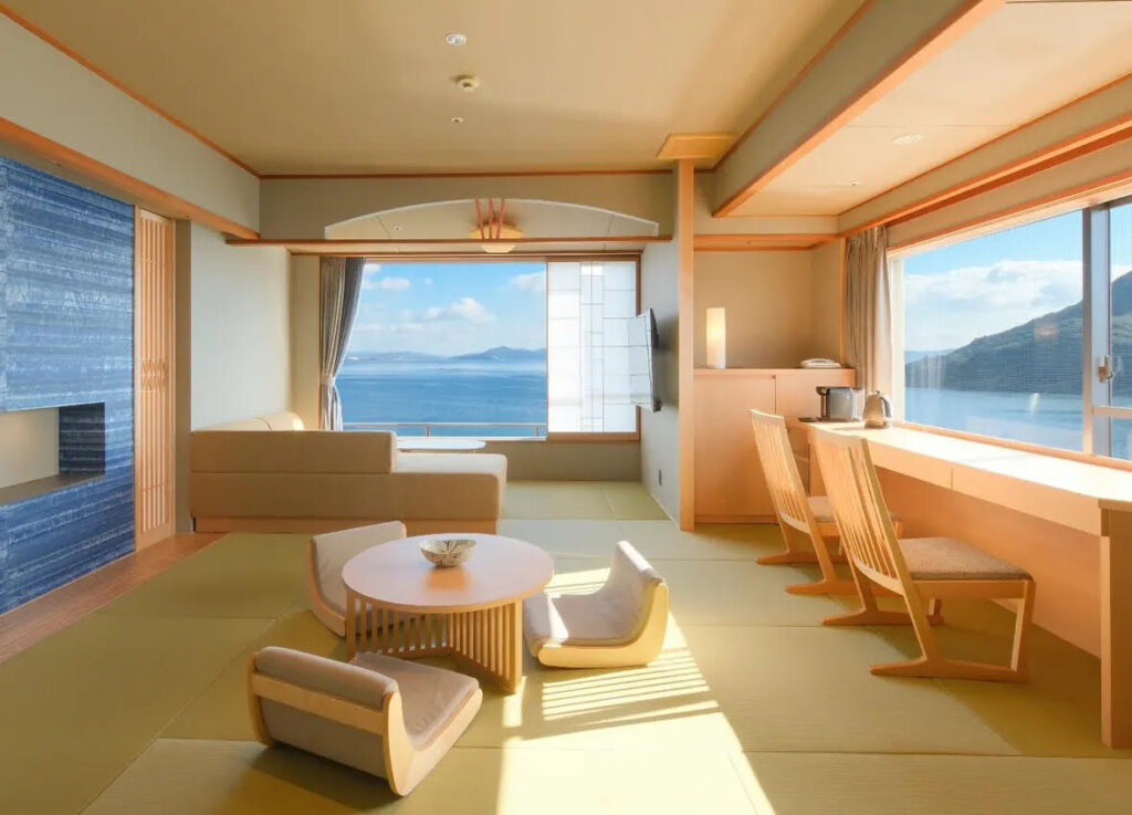 窓の向こうには、穏やかな海と島々が織りなすやわらかな風景です。季節によって光の色も風の香りも変わり、訪れるたびに新しい発見があります。喧騒を離れ、ただ自然と呼吸を合わせる、そんな時間を過ごしてみませんか?