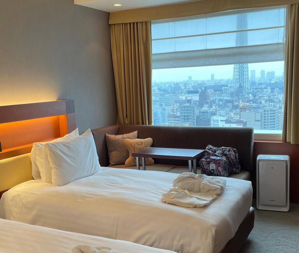 スカイツリーの見える18階のツインルームがおすすめです。バストイレ独立、室内段差なく、杖歩行の主人も安心して利用出来ます。バストイレ部分がフローリングの作りです。