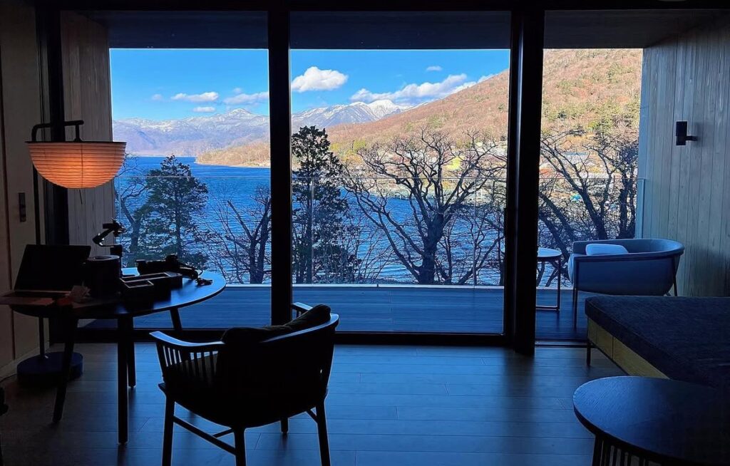 スパが最高の中禅寺湖畔のホテルです。中禅寺湖畔に佇み、男体山を一望できるラグジュアリーリゾートとなっています。日本家屋の縁側に見立てられていて、栃木の伝統工芸を活かし、日本の繊細なミニマリズムを体現しているんです。