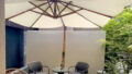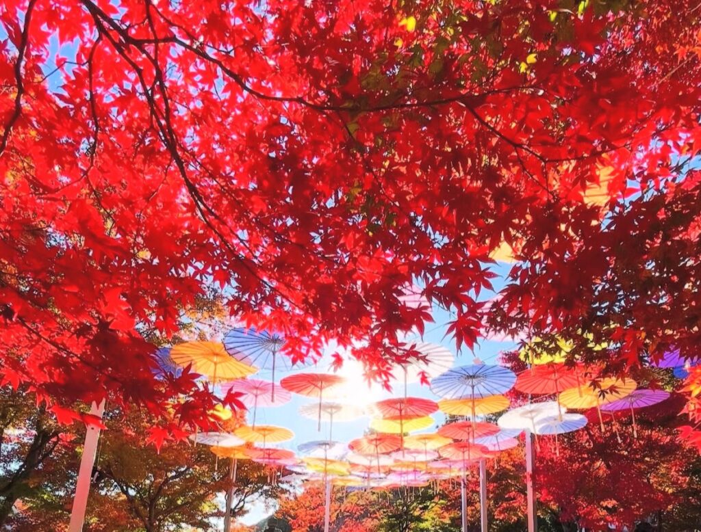 アンブレラスカイが楽しめます。色とりどりの傘が厄を避け、運を開いてくれるんです。富貴滴水の庭はお部屋とお庭が一体となるよう造られいます。畳からお庭、敷石まで市松模様が途切れることなく続いて行くことから、繁栄や継続、不変の意味が込められているんです。