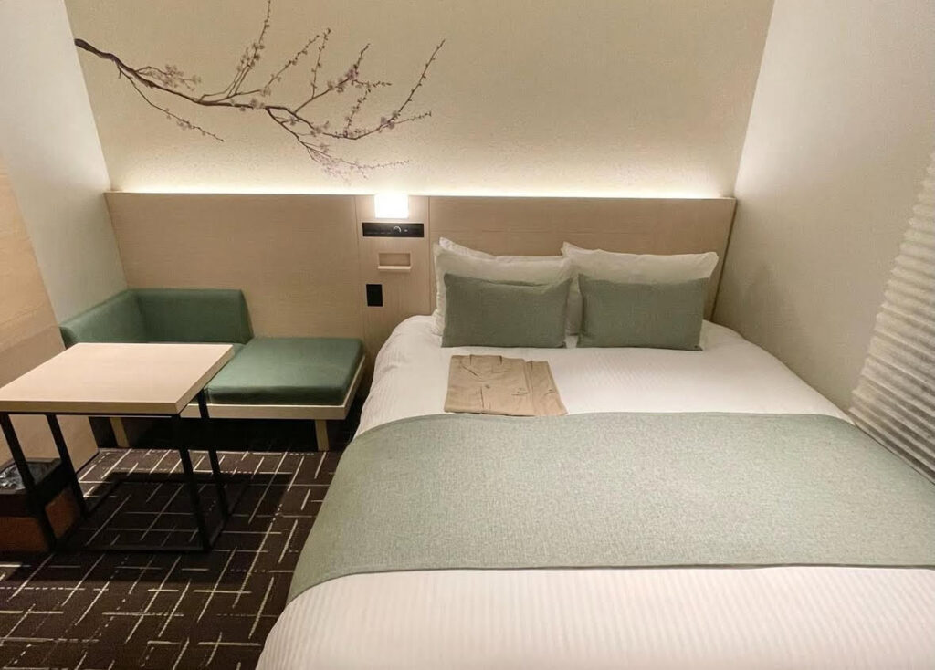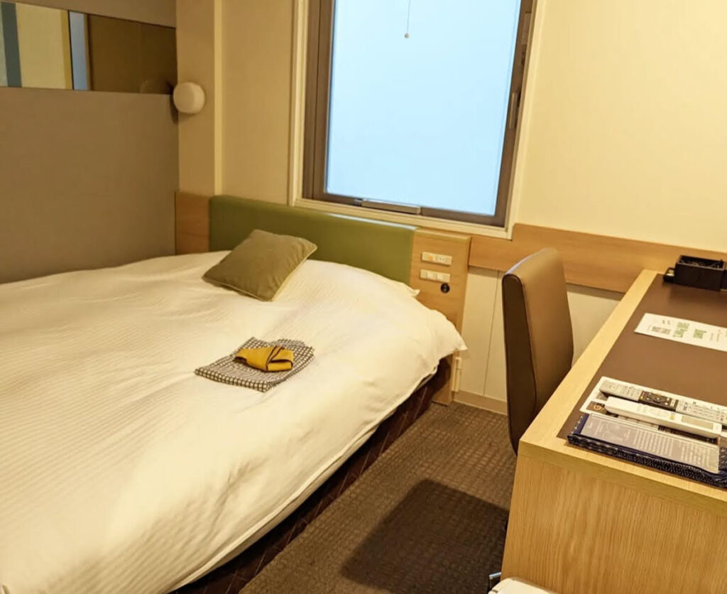 東京ミッドタウン八重洲の隣に建つ、ベスポジのビジネスホテルにステイです。このお部屋は最上階14Fにあるデラックスダブルがおすすめとなっています。ビジネスホテルにしては広くてゆったりしているんです。