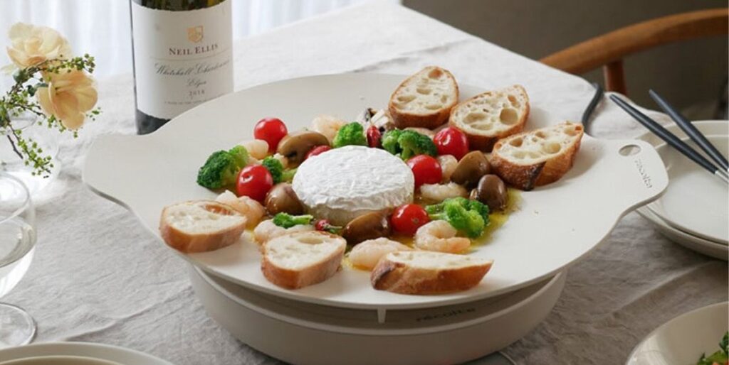調理できる大皿[クッキンググリドルプレート]と円形フォルムの[卓上IHヒーター]がセットになっています。