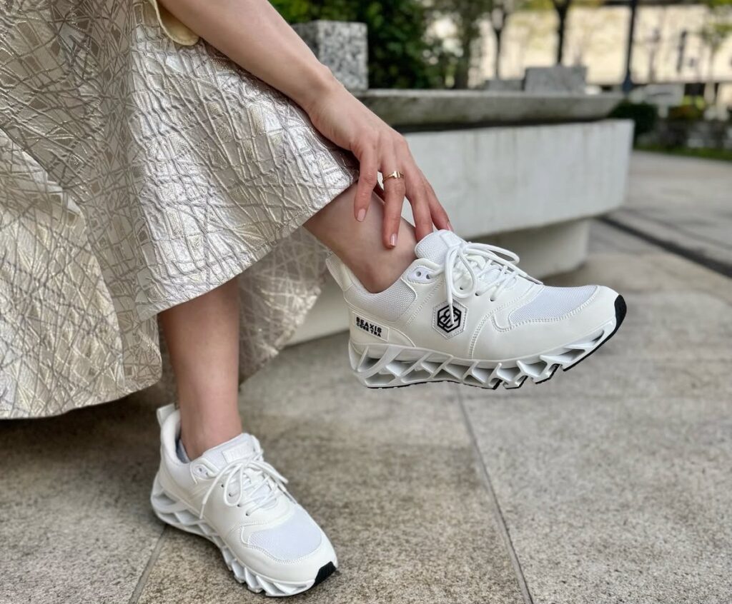 おしゃれでシンプルな見た目なので、通勤にも履きやすいのが嬉しいポイントです。空の青に映える真っ白なスニーカー!