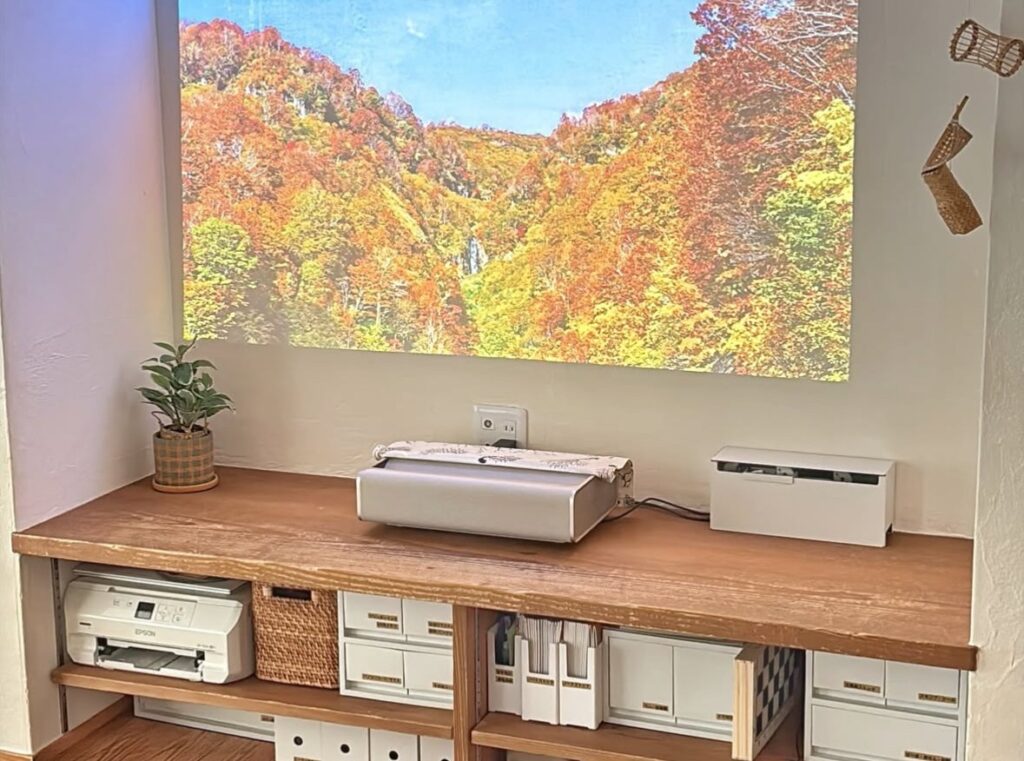 超短焦点プロジェクターです。洗練された空間にもおすすめとなっています。美しく馴染むんです。壁からわずか24cmの距離で100インチの大迫力スクリーンを映し出せる超短焦点プロジェクターです。