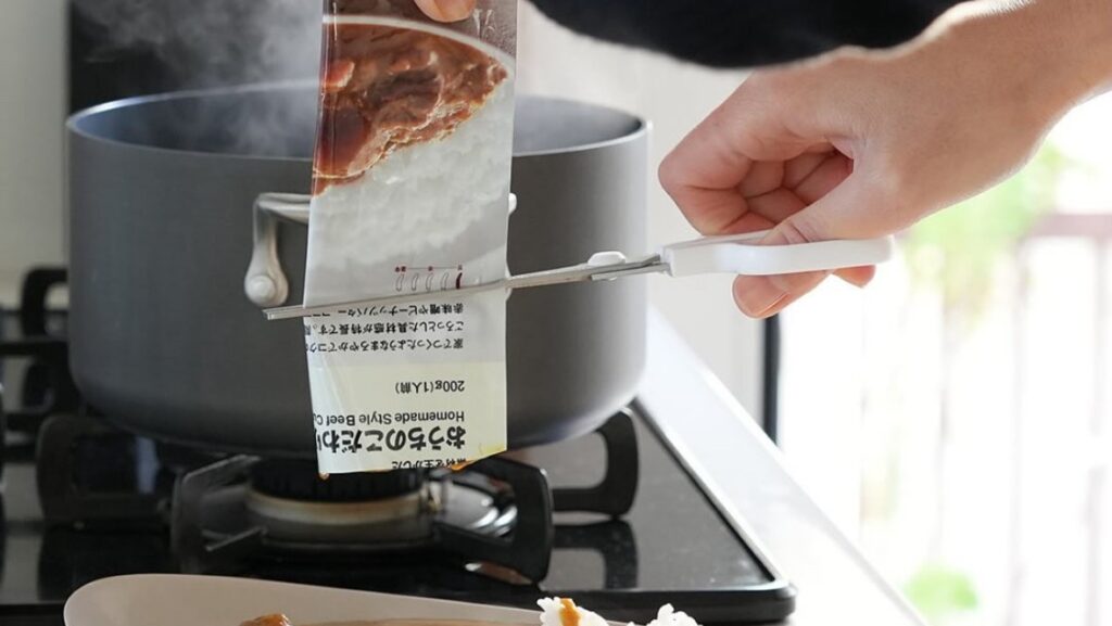 湯せんで温めた熱々のパウチをお鍋から引き上げるのも簡単!トースターで焼いたパンを取り出すときも『れとらくはさみ』を使うのが◎