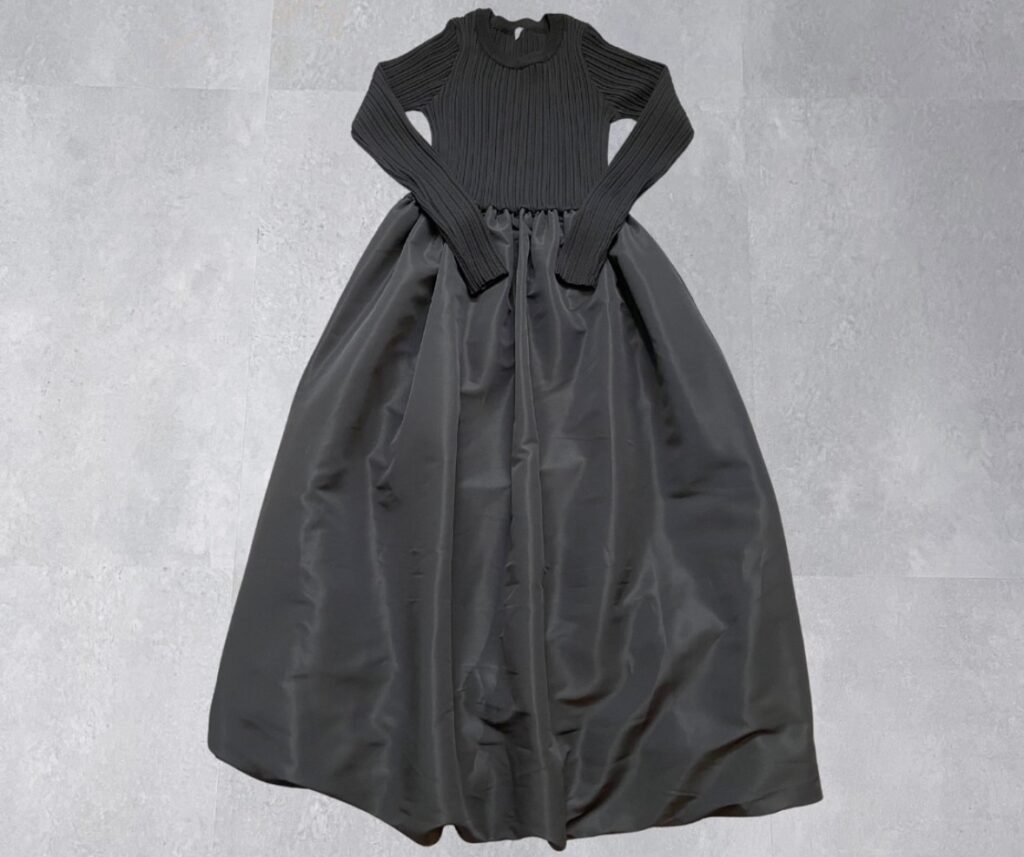 リブ素材のトップスとバルーンスカートがドッキングしていて、羽織りを変えて綺麗めにもカジュアルにも使えます。ゆったりシルエットで動きやすいです。トップス部分は、リブニット生地で、