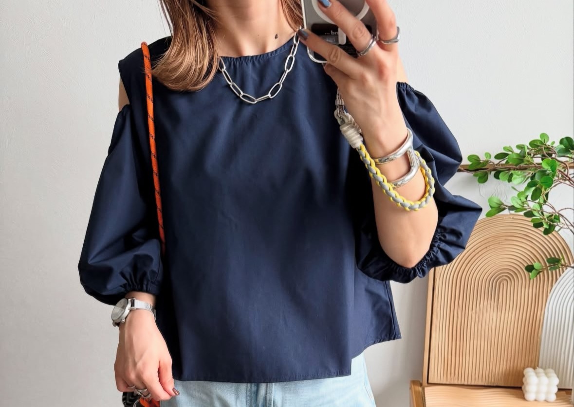 オープンショルダーだけど肩周りは安定感があって動きやすいブラウス!「オープンショルダーブラウス」