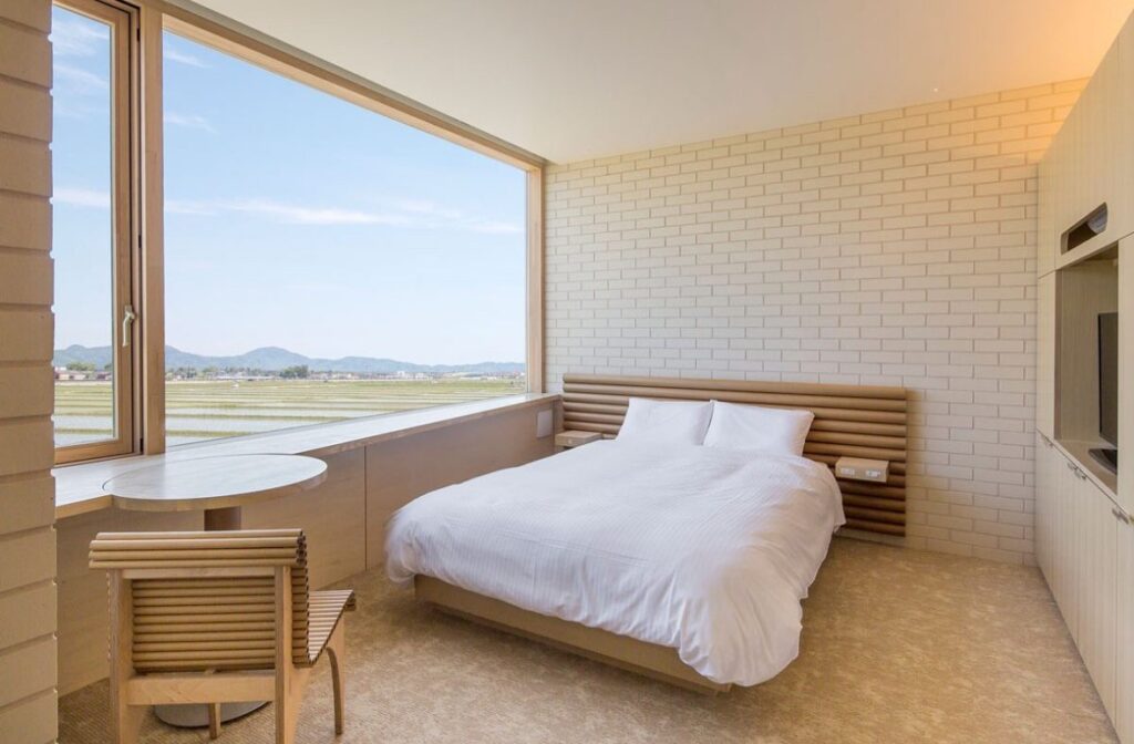 水田を眺めながら非日常感を心ゆくまで楽しみたいという方にオススメです。お部屋のカーテンを開けるとそこに広がる際限のない田園は絶景!