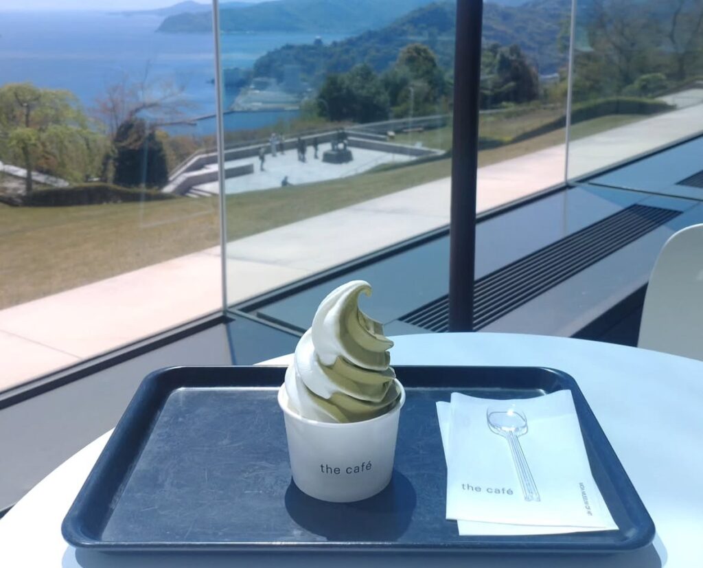 海が綺麗に見えて眺め最高です。万華鏡の中に入ったような円形ホールや茶の庭があったり、見どころ満載となっています。そして館内にあるthe cafeでひとやすみしましょう。抹茶とバニラのミックスソフトがおすすめです。