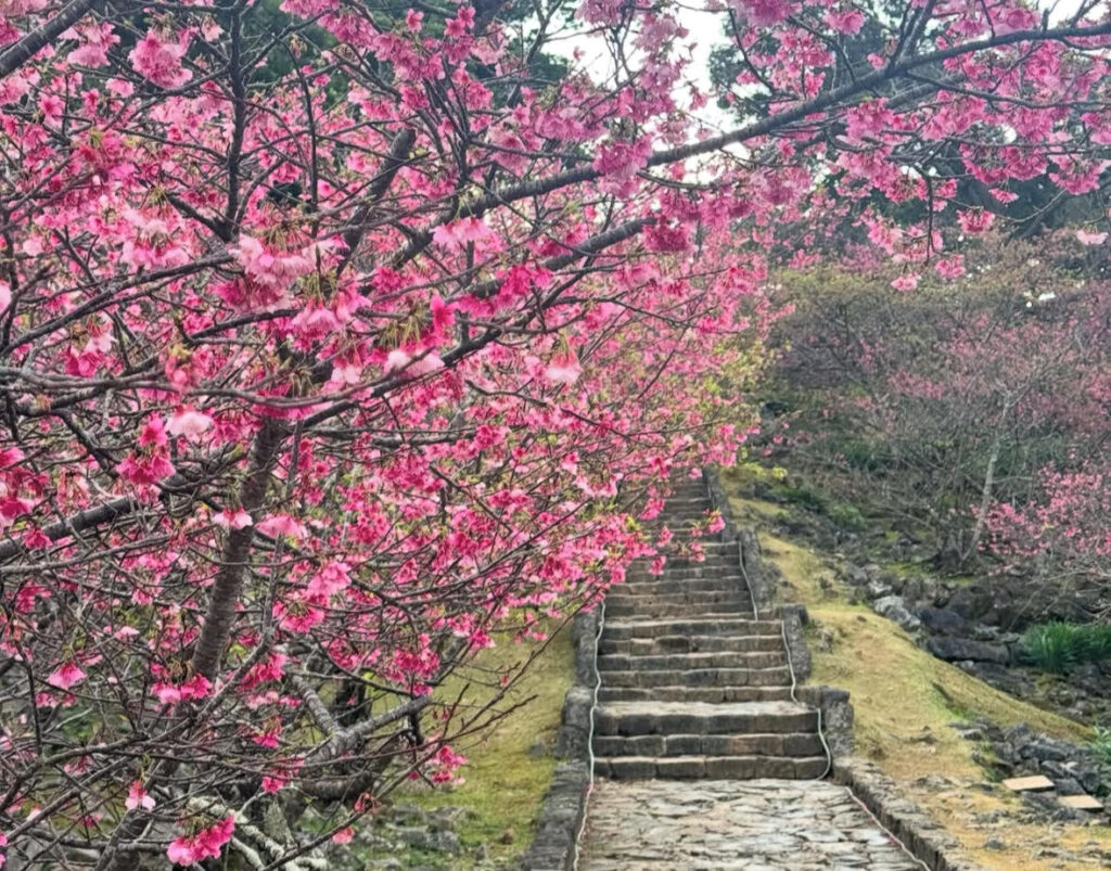 世界遺産にも登録されています。日本一早い世界遺産の桜まつりが楽しめるんです。濃いピンク色をしたこの桜は、台湾由来となっています。城内に約200本植えられていて、1月下旬〜2月頭まで見頃が続く!