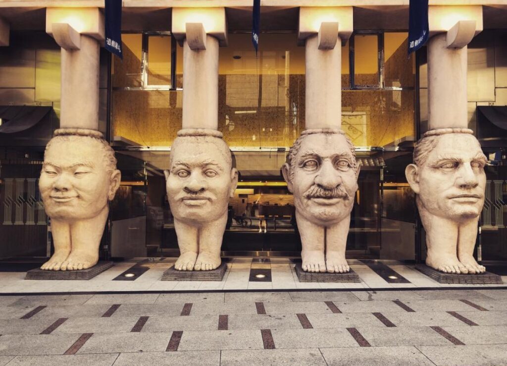奥より順に西洋人、アラブ人、アフリカ人、東洋人、ドイツ車となっております。国籍は問わず、肌の色も関係無く、千客万来といったところでしょうか。左から東洋人、アフリカ人、アラブ人、西洋人を表しており、「世界中のお客様をおもてなししたい」との想いを込めています。
