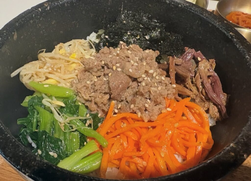 石焼きプルコギビビンパ定食(1100円)がおすすめです。具材もたっぷりあって、野菜も豊富で味も日本人好みの韓国料理になっています。ランチは1000円前後なのでコスパの良さも素敵です。