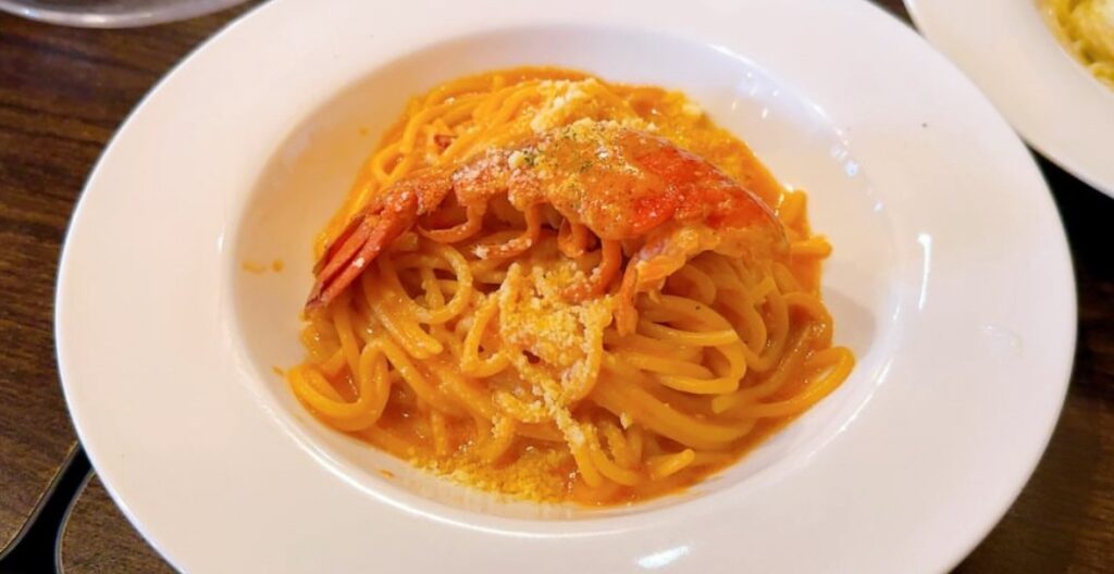 オマール海老のトマトクリームパスタ (2480円)がおすすめです。テール半身かテール1尾で選べます。せっかくなので1尾にするのがおすすめです。麺は生パスタなのでもっちもちとなっています。