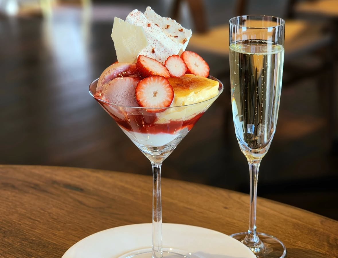 写真映えするイチゴパフェを頂く前にも、美味しいお料理がたくさんあります。いちごが甘くてジューシーで、美味しいです。美しくゴージャスとなっています。中央には見た事ない大きなパフェが乗っているんです。