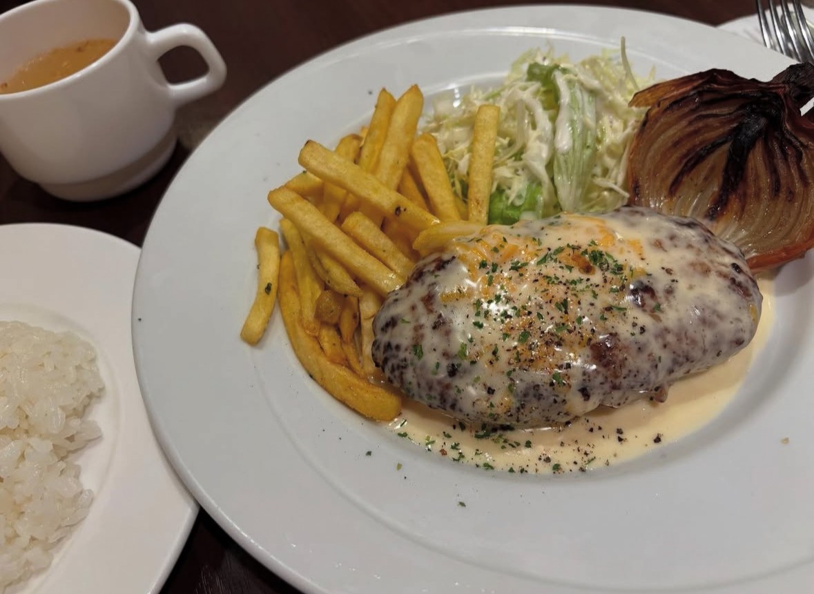ふわふわジューシーなハンバーグは肉の旨味が凝縮され、特に深みのあるデミグラスソースが秀逸です。とろとろの目玉焼きを絡めれば、さらに濃厚な味わいになります。イタリアンハンバーグもまた異なる魅力があり、どちらも満足度の高い一皿です。