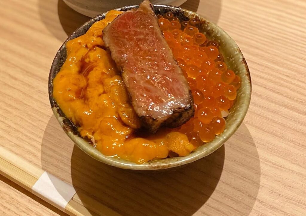 ここはなんと、焼肉屋かと思いきや魚しか登場しません。うにといくら丼に焼いた本マグロが乗った三色丼がおすすめです。それが含まれるコースをいただきましょう。うにといくらとマグロって…最強のコラボすぎるし、丼の赤酢飯はなんとおかわりし放題です。
