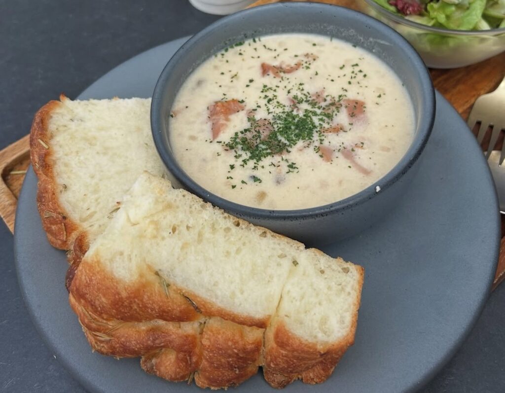 めっちゃ気持ちいい隅田川沿いのテラス席にて、清澄橋とスカイツリー眺めながらクラムチャウダーのランチセットがおすすめです。あさりとベーコンめっちゃ入ってて美味しい!フォカッチャとも合ってます。