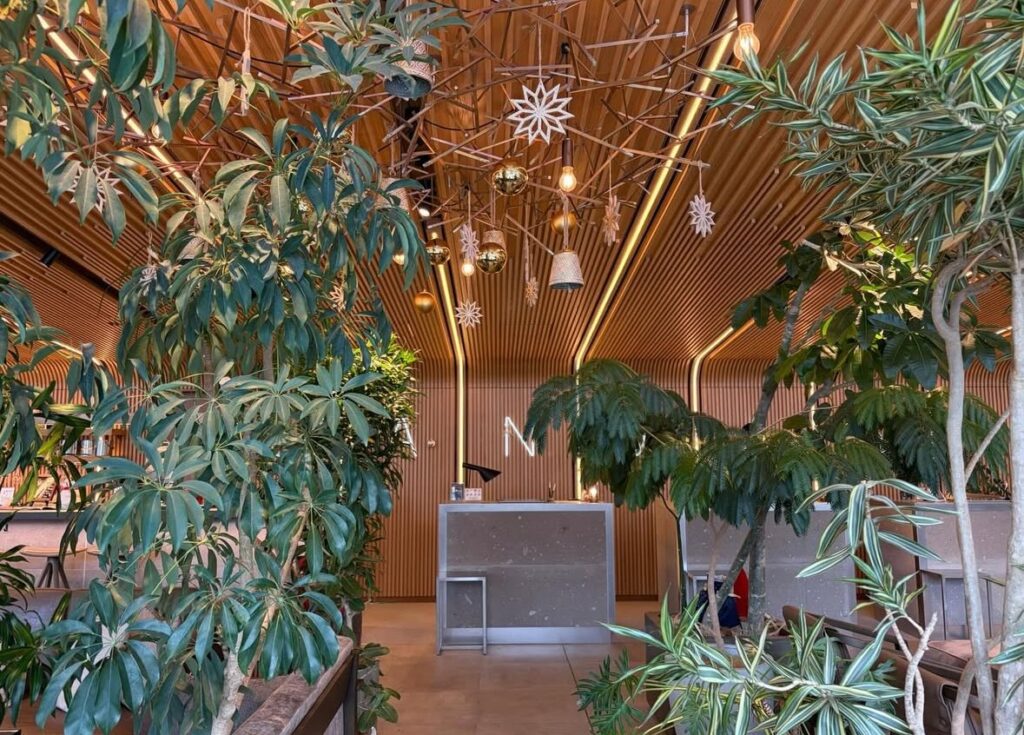 最上階 (8F) のロビーが素敵です。建物の外観は角を落としたデザインも少し張り出したデザインも最高となっています。ウロコみたいに光でキラキラ光るタイルも美しいです。モダンで素敵◎アフタヌーンティー奥にラウンジがあります。