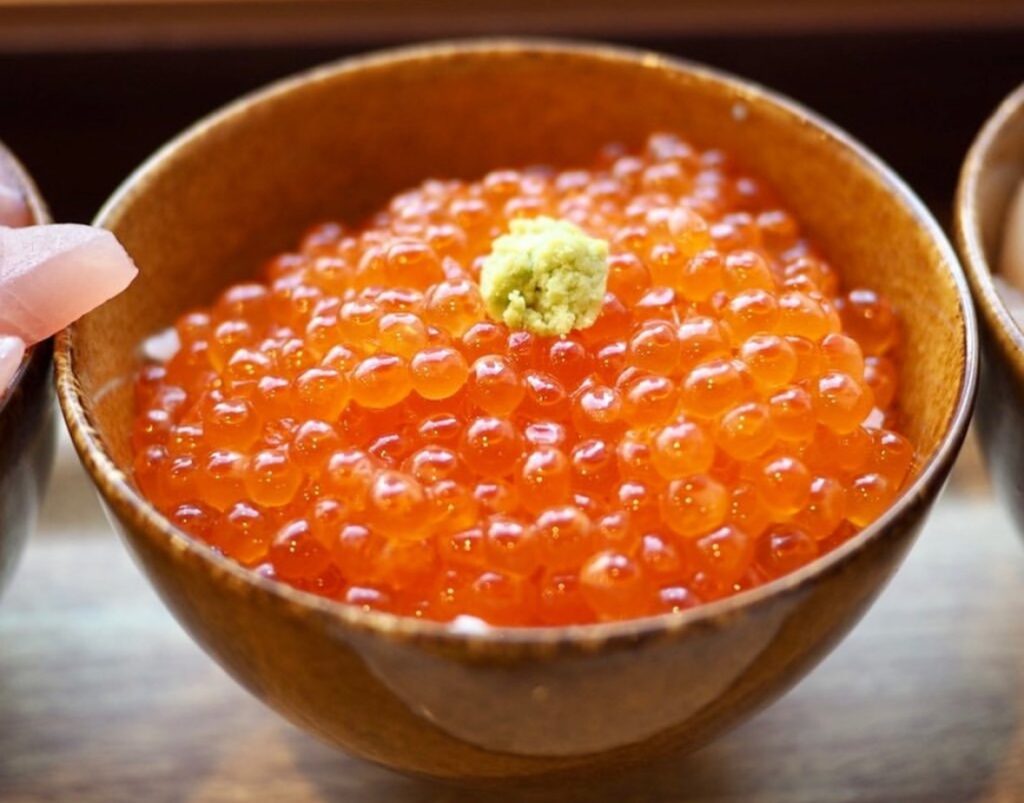 いくら丼、朝食バイキングで食べ放題です。何杯でも食べ放題となっています。甘エビ・マグロ・炙りサーモン丼・ホタテ貝柱・イカ・カニほぐし身丼・ジンギスカン、十勝豚丼の肉なども食べ放題です。
