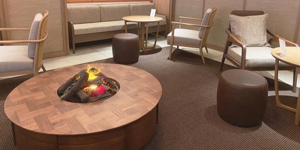 卓上焚火で楽しむ「マチナカ TAKIBI BAR」ホテル前庭に登場しました。室内温度約 20 度です。卓上焚火を自分で育て、焚火フードを楽しめます。