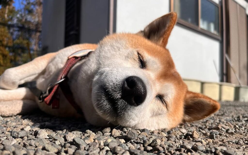 境内では遊んでやオーラを抜群に振り撒く看板犬のムクちゃんが◎弁財天の像と七福神の幟があります。