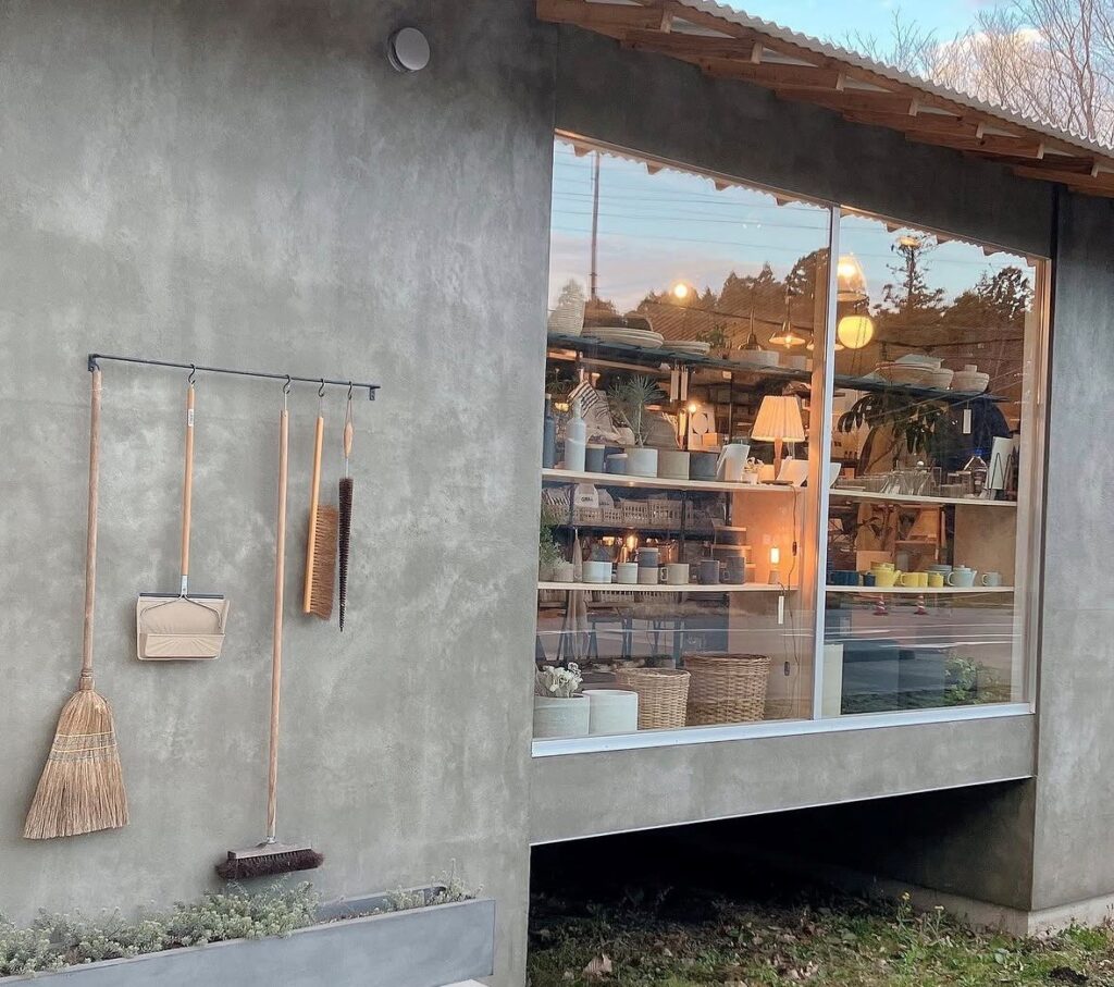 奥行きのある、三角屋根の生活雑貨店です。栃木県の那須町にお店を構えています。使いやすさも手に取った心地もじっくりと吟味され、長く愛用したくなる生活道具が並ぶんです。そのお店の外観は無機質なグレーとなっています。