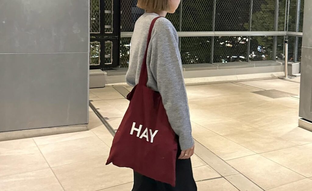 長いハンドルとコントラストカラーの HAY ロゴが特徴で、機能的で個性的なショッピング バッグ!「HAYコットンバッグ」