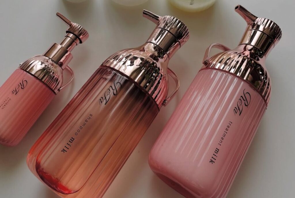 白と黒のシンプルなボディなんだけど、ボトルのカッティングがキラキラして素敵です。シャンプーは糸引くほどのとろみがあります。