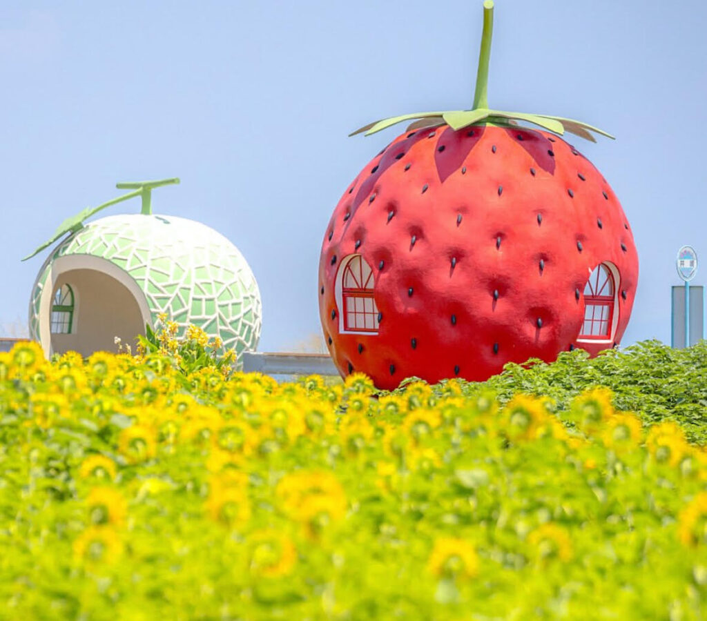 春の菜の花、秋のコスモスの時期は特に可愛い◎全5種類16基のフルーツを模した、バス停が国道沿いを中心に設置されています。