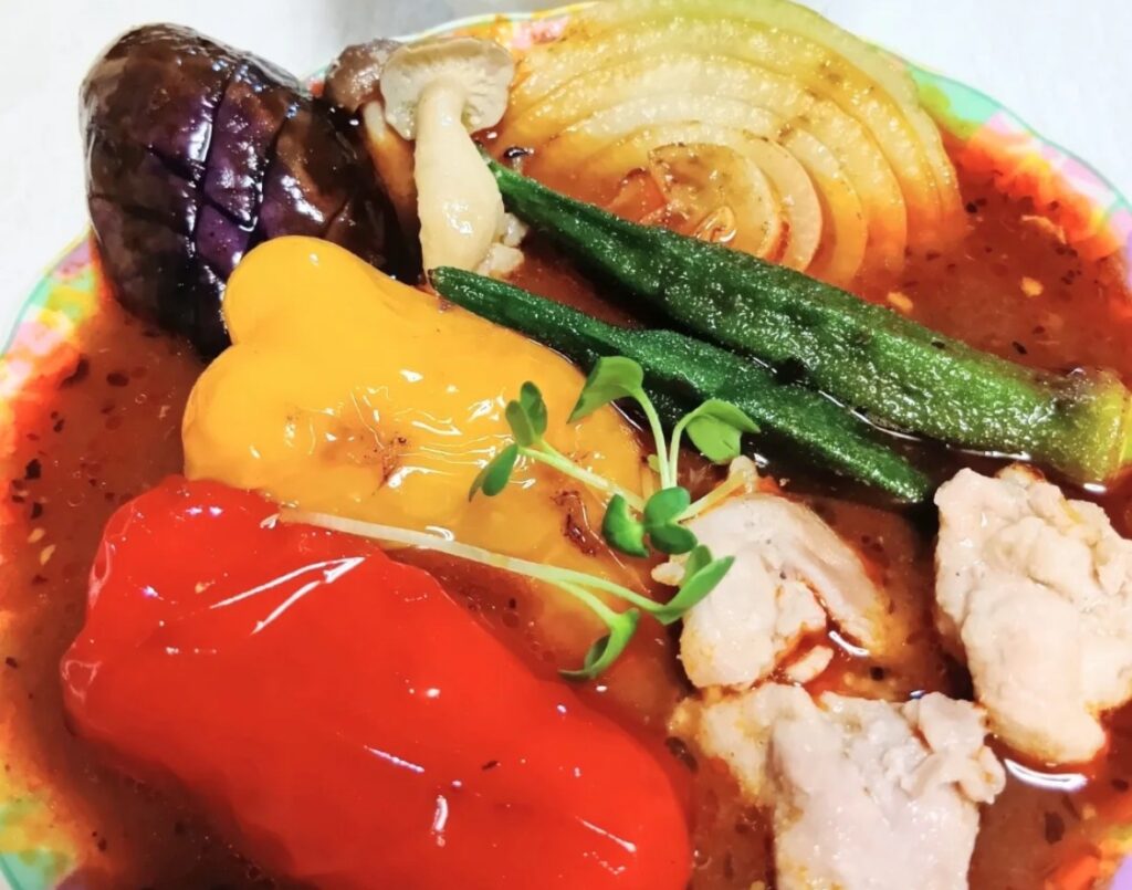 どっちもごろっと具だくさんでじゃがいも、にんじんのお野菜も入ってるんです。のままでもいいんだけど、素揚げしたレンコン、ナス、カボチャ、ミニトマトの野菜を追加でトッピングするのもおすすめ!