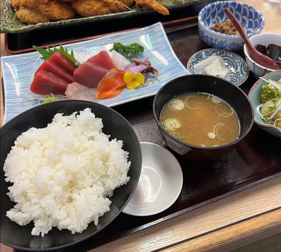 タブレットで注文するスタイルでランチメニューから『刺身の盛り合わせ』と『記念フライ定食B』を注文するのがおすすめです。『記念フライ定食B』これはボリューム半端ない◎カキ、タイ、イカや野菜等…食べきれません。
