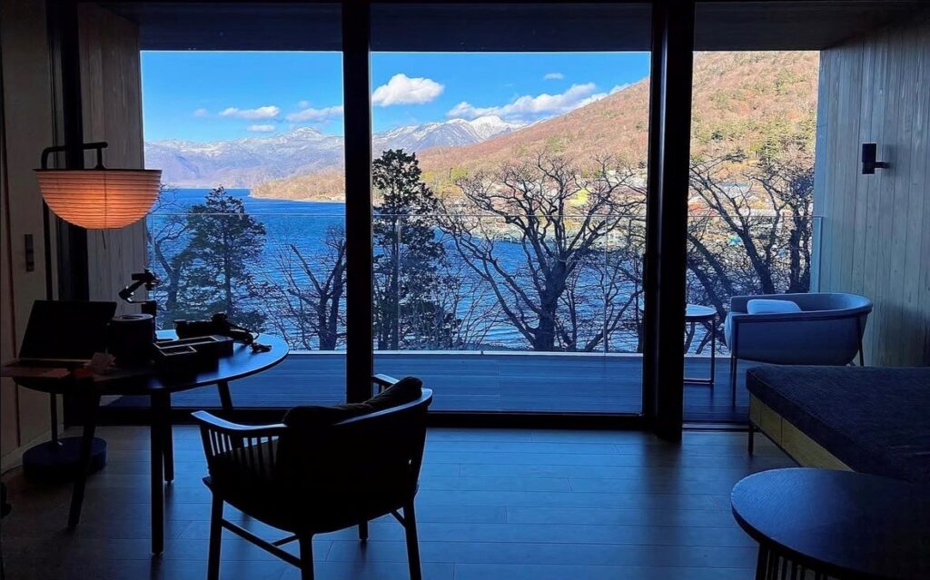 中禅寺湖畔に佇み、男体山を一望できるラグジュアリーリゾートです。日本家屋の縁側に見立てられていて、栃木の伝統工芸を活かし、日本の繊細なミニマリズムを体現しています。