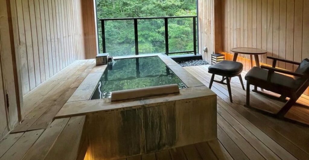 お部屋からもスケスケガラスで、五右衛門風呂が見えます。「何もしないをする」ができるお宿です。時計もテレビもないと大自然の中にぽつんとあるお宿となっています。部屋に露天風呂付きです。