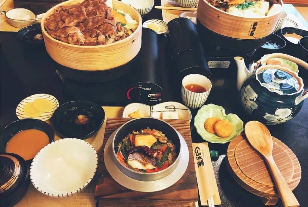 あり釜いっぷくコース くつろぎ釜飯(鯛・鮭・山菜・タコ)1,450円や神戸牛の湯けむり蒸し(ミニくつろぎ釜)3,400円なども大人気です。人気店すぎて、この有馬温泉の中で最も入店ハードルが高いと思われるミシュラン掲載店となっています。