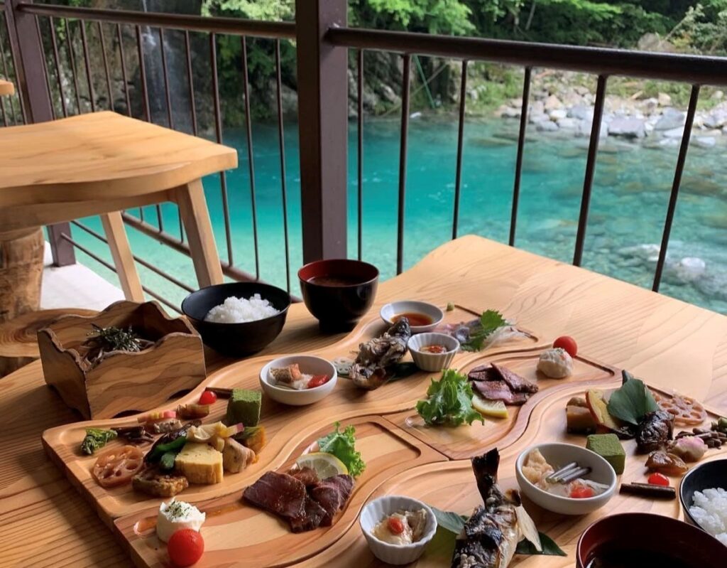 エメラルドグリーンの美しい川を眺めながら味わう食事は絶品です。おすすめは1日30食限定の「峡定食」◎