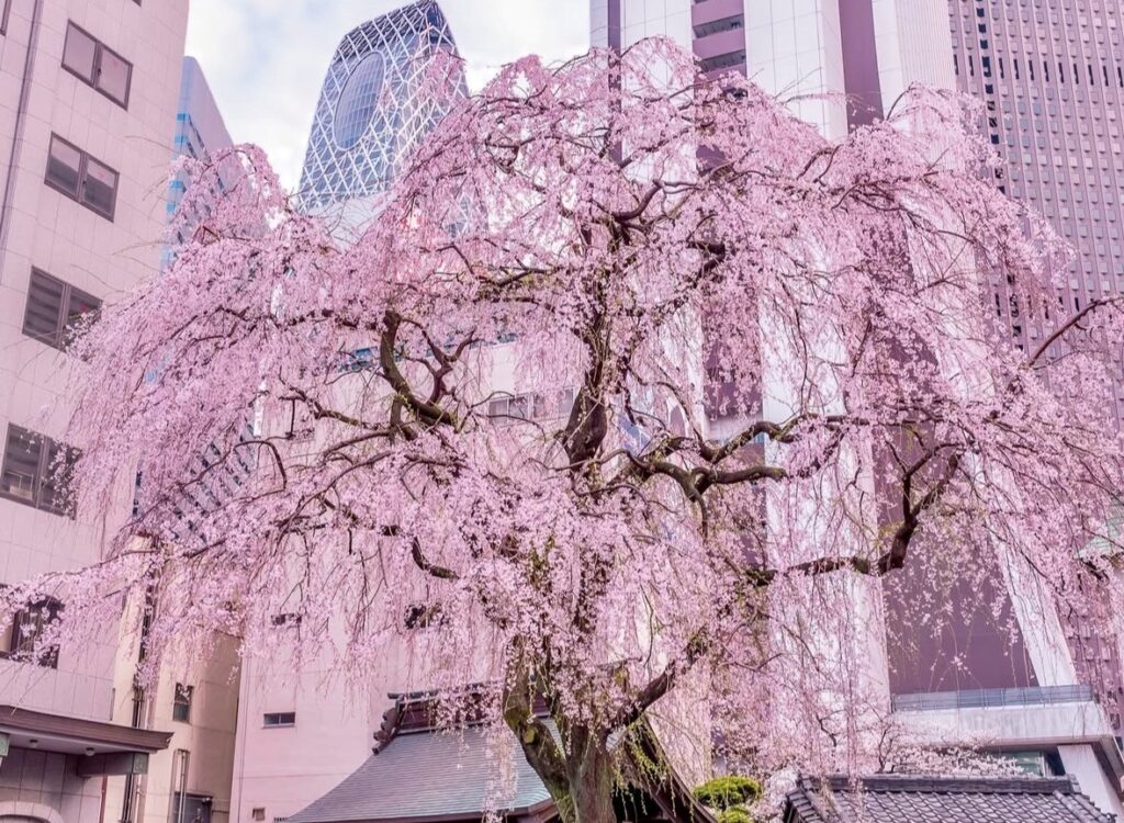 西新宿のオフィス街、青梅街道沿いにオアシスのように山門前に咲く桜が美しく、境内ではサラリーマンやOLの方が桜の下お弁当を食べる…なんて事もあるのだそう!