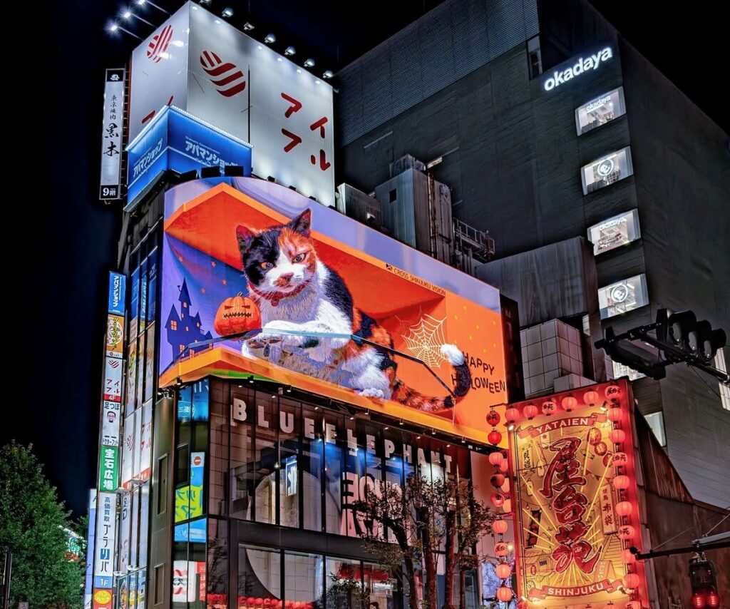 「3D巨大猫」は15分毎に超大型ビジョンに現れて、可愛い仕草を見せてくれる!「新宿駅東口交差点」